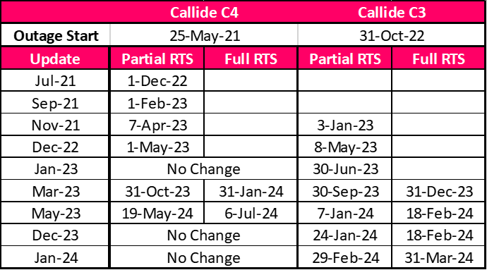 To add to the Queensland story, the long-awaited return of Callide C units, both of which have received numerous return-to-service (RTS) updates, was delayed and now the C3 unit is not due back until 29 Feb-24 and C4 unit is due to return on 19 May-24. The history of the outage and return-to-service announcements is shown in the table below: