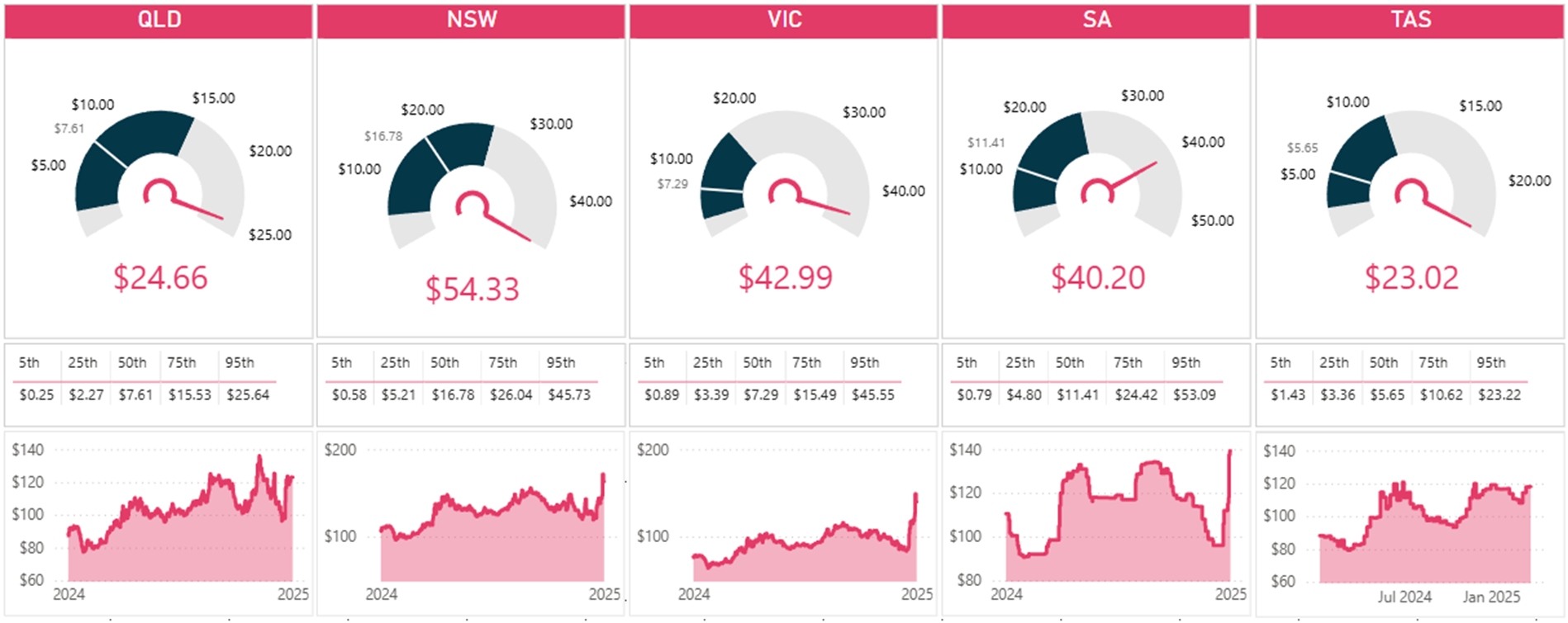 In June 2025, the daily gas spot prices reached the highs of approaching $20/GJ, whereas in June 2022, the maxima was closer to $45/GJ. A dramatic difference and you may recall for the winter of 2022, that some gas powered generation could not run at the $300/MWh administrative price cap profitably, which led AEMO to suspend the market and take control of the assets. Following this event, the Administration Price Cap was revised to $600/MWh.