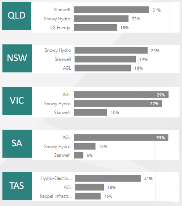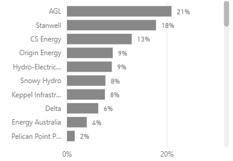 In 2019 across the NEM, assets owned by AGL were the most dominant Price Setter (21%), followed by the Queenslanders of Stanwell (18%) and CS Energy (13%).