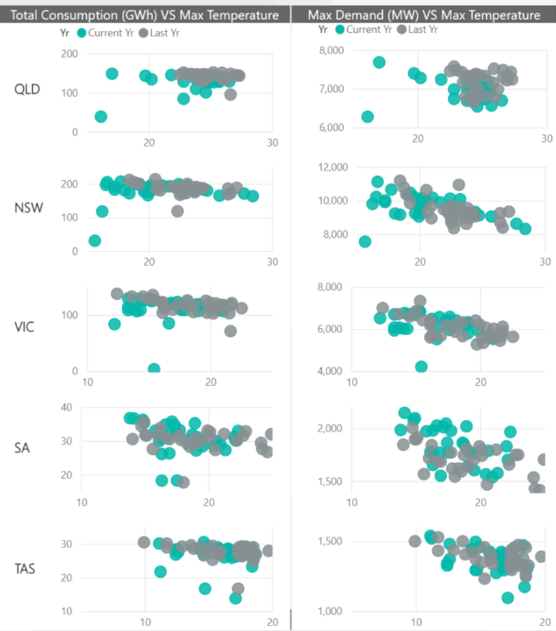 The plot charts to the right compare maximum daily temperatures with daily total energy consumption and maximum demand levels. NSW and QLD show a number of cold day outliers, while VIC and SA show many cooler days.