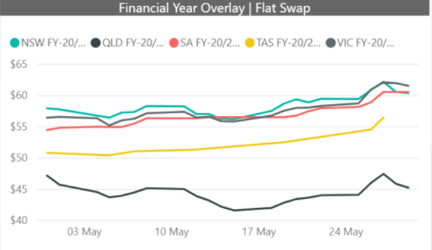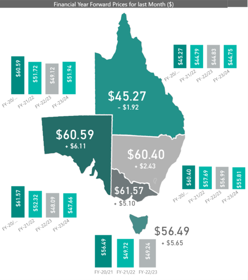 SA, VIC and TAS saw FY-20/21 forward prices rise in the order of $5-6/MWh, while NSW rose by about $2.50/MWh.