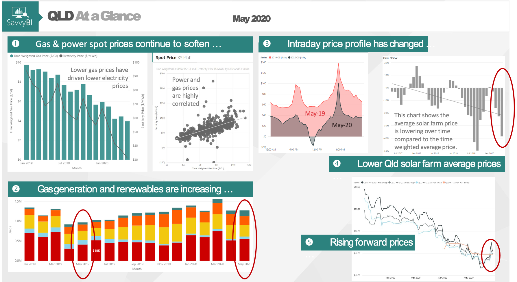 We have also introduced an “At a Glance” summary page for each Region of the NEM depicting the main 4 or 5 events of the month affecting that Region. There is a common theme that spot electricity and gas prices remain soft, although the forward market for the later years is rising.