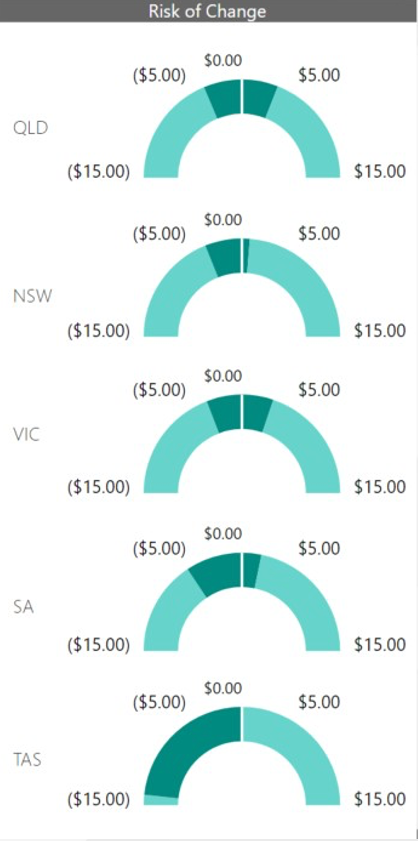 The risk-of-change metrics remain similar to the previous month, with the mainland states showing little risk-of-change in the spot price. Tasmania is now showing an increased risk-of-change for lower spot price outcomes.