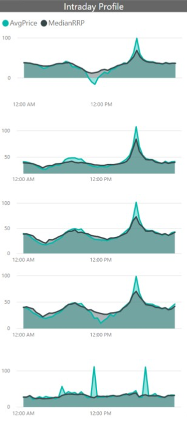 In the intraday spot price profiles to the far right, QLD shows low average price around 10:30am due to extreme negative price outcomes on 2-May when the average price fell to minus $700/MWh. All regions show high average spot prices during the evening peak corresponding to days when half hour spot prices went to $200-300/MWh.