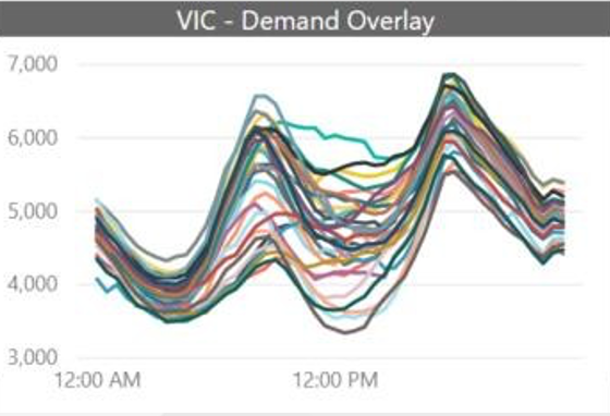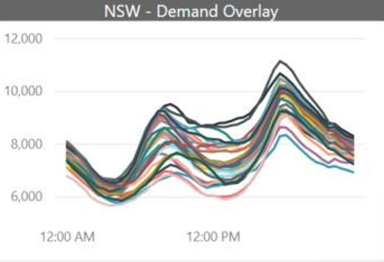 The plot charts to the right compare maximum daily temperatures with daily total energy consumption and maximum demand levels. NSW and QLD show a number of cold day outliers, while VIC and SA show many cooler days.