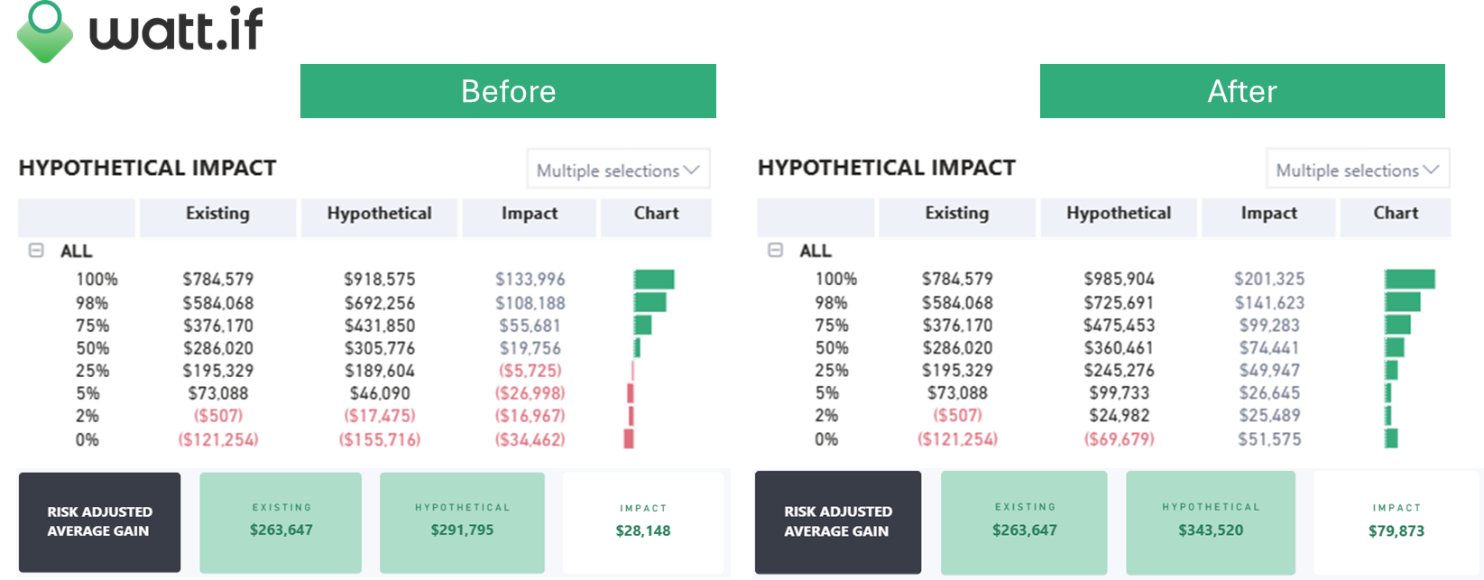Below is an example of a Portfolio's expected quarterly trading profit trading across the NEM using about $600,000 of working capital. The left side of the figure shows the expected profit distribution of the Existing portfolio, and then a group of small trades are tested to show the Hypothetical Impact. The end of quarter Risk Adjusted Average Gain improved from $264,000 to $292,000 which is a favourable movement of $28,000. This risk adjusted gain is after taking account of weighting the increased potential losses more heavily then the potential gains.