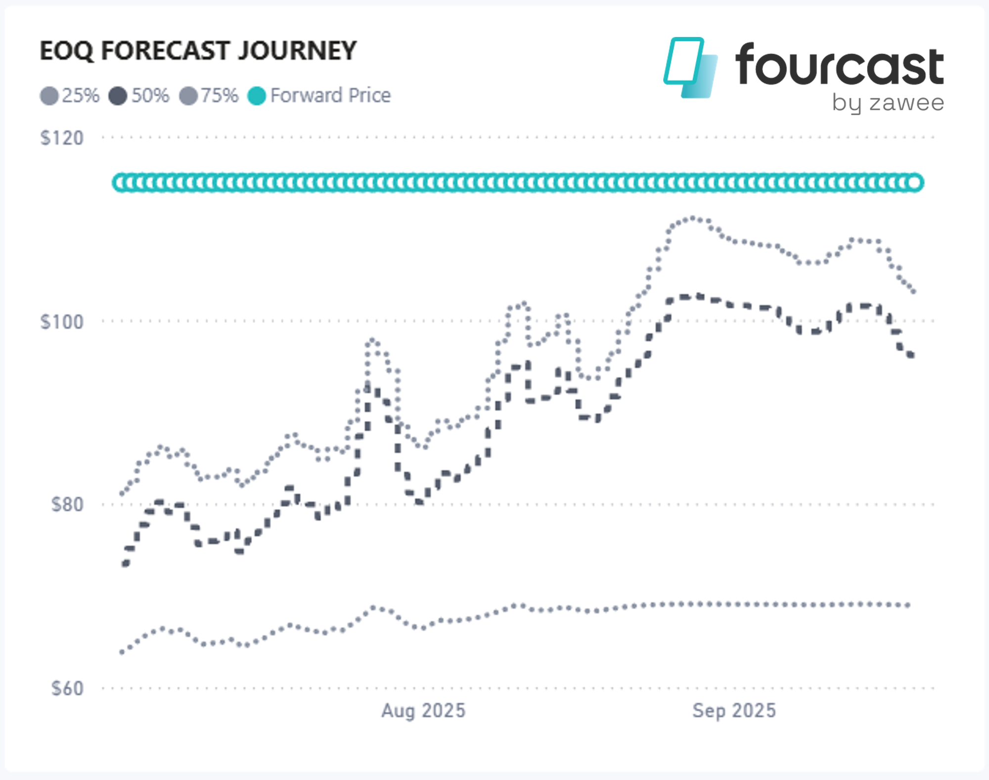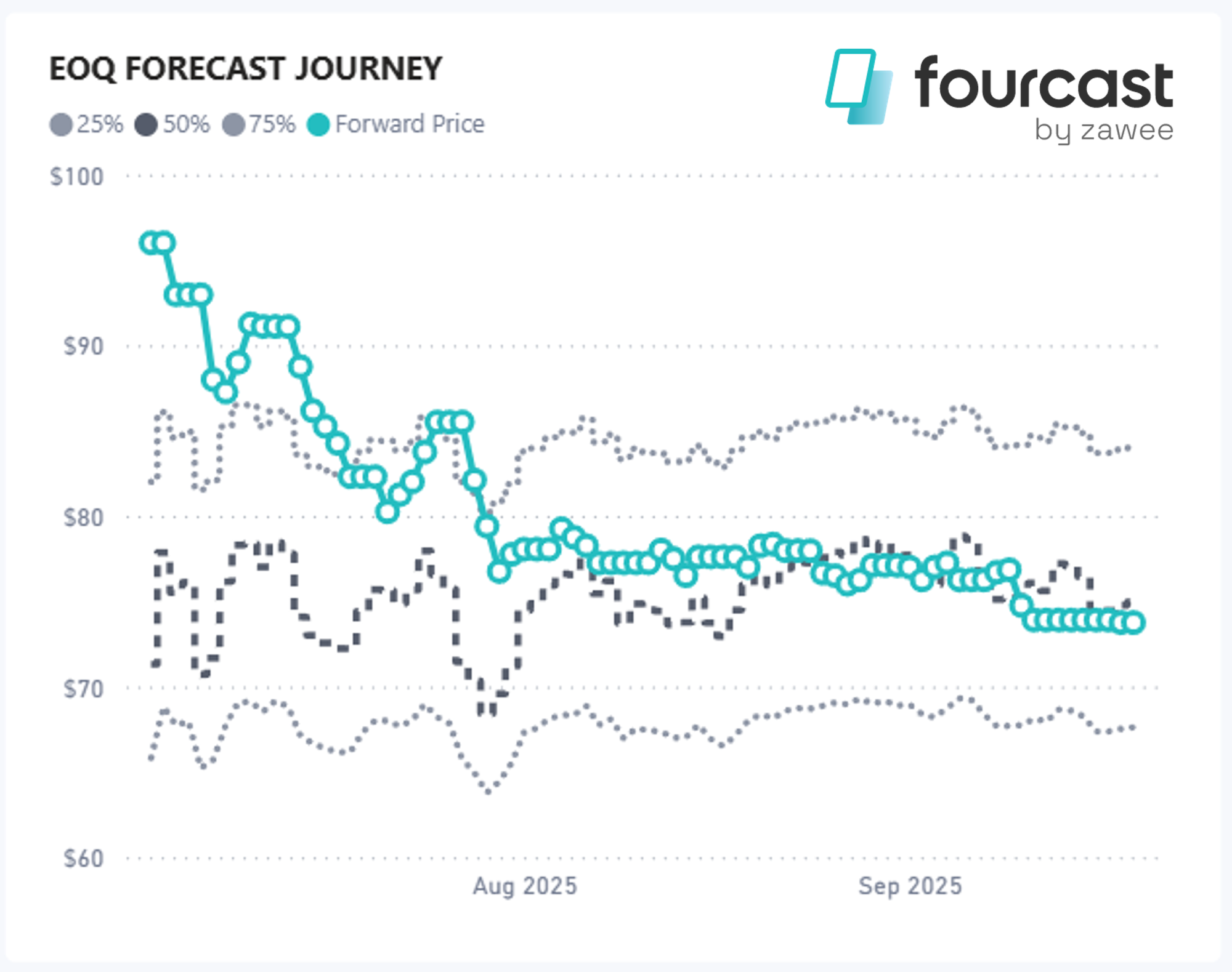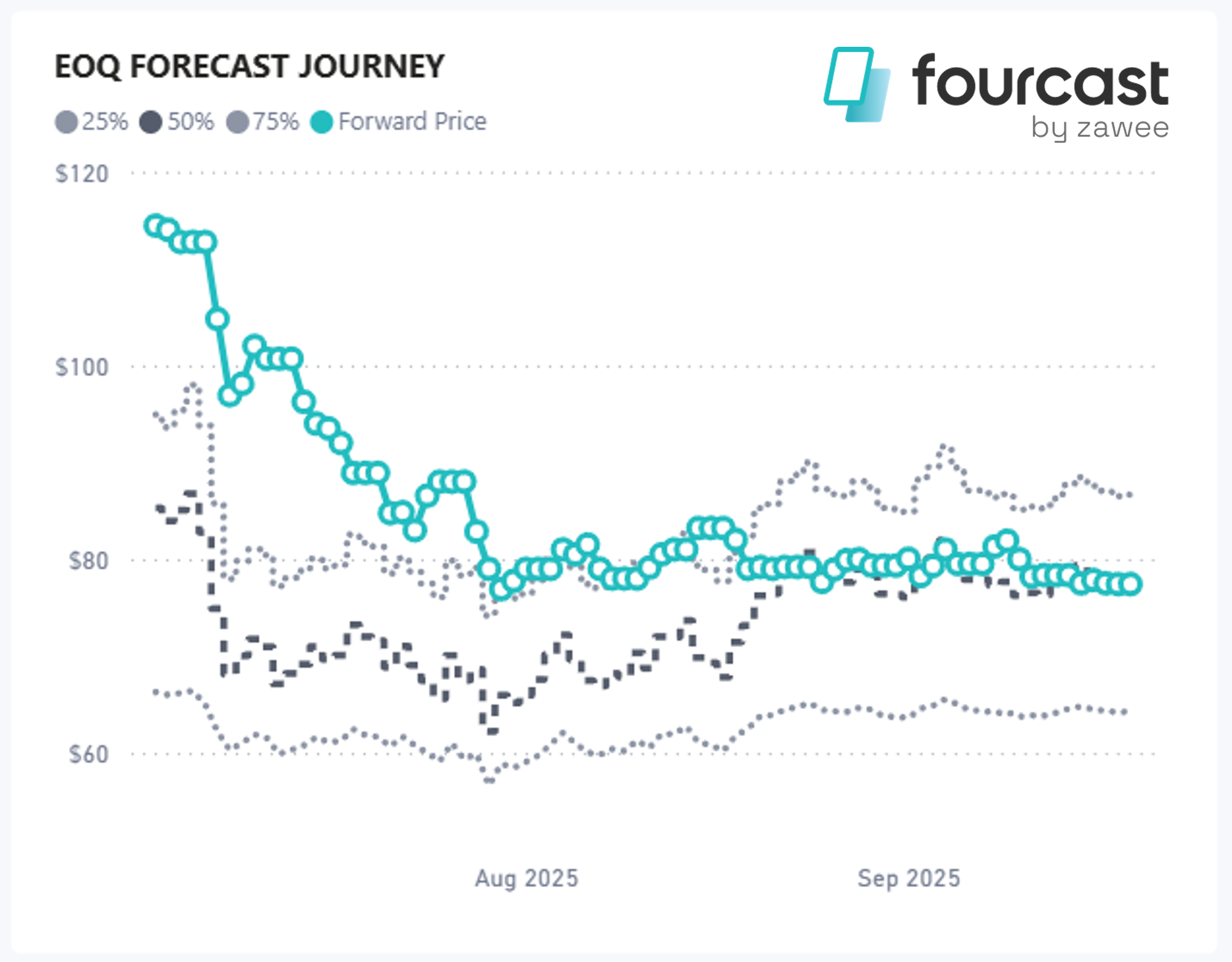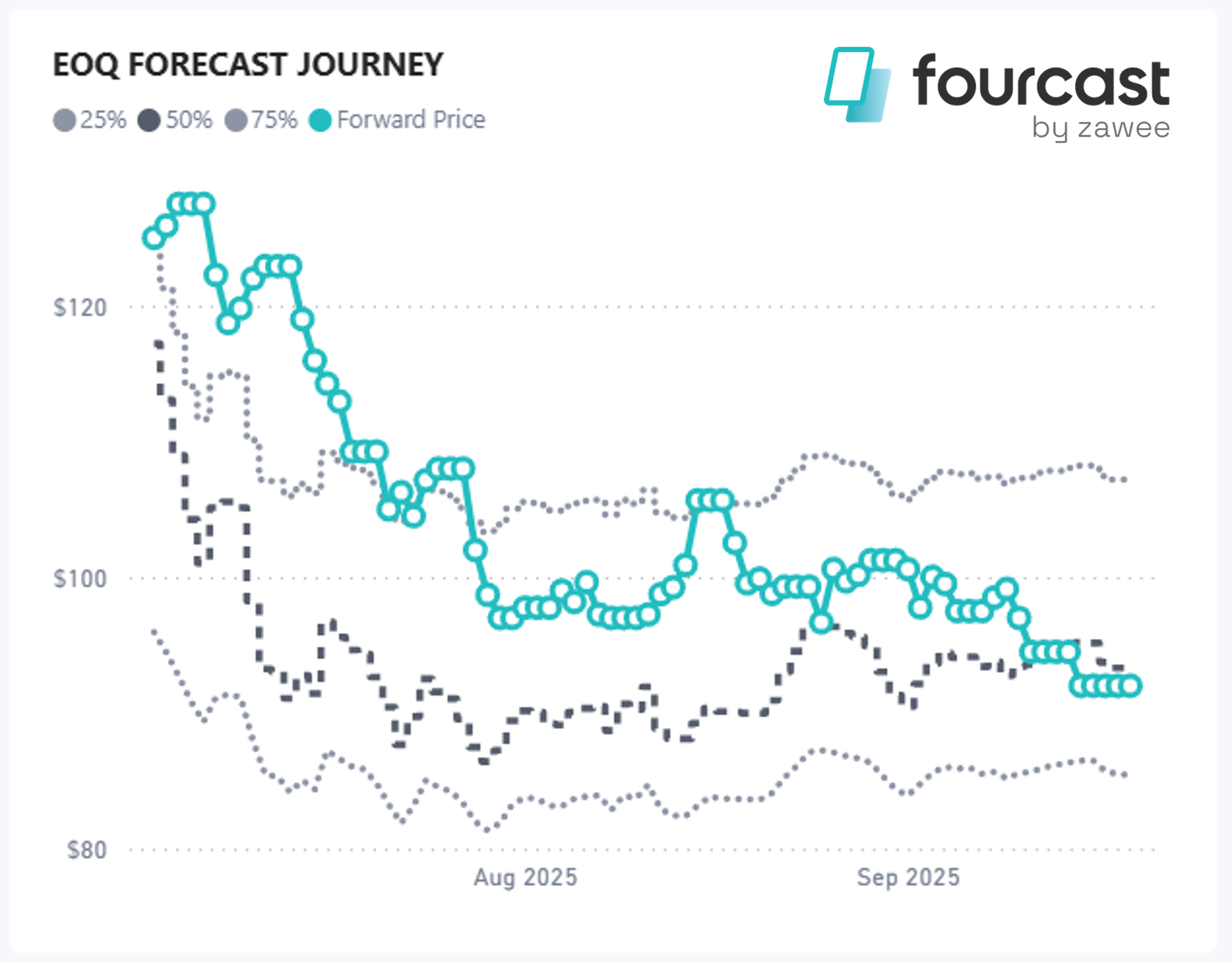 The chart below shows the daily forward price (blue circles) through each day of the quarter and then our median forecast (dark grey), accompanied by the 75th and 25th percentile forecasts (grey dotted lines).