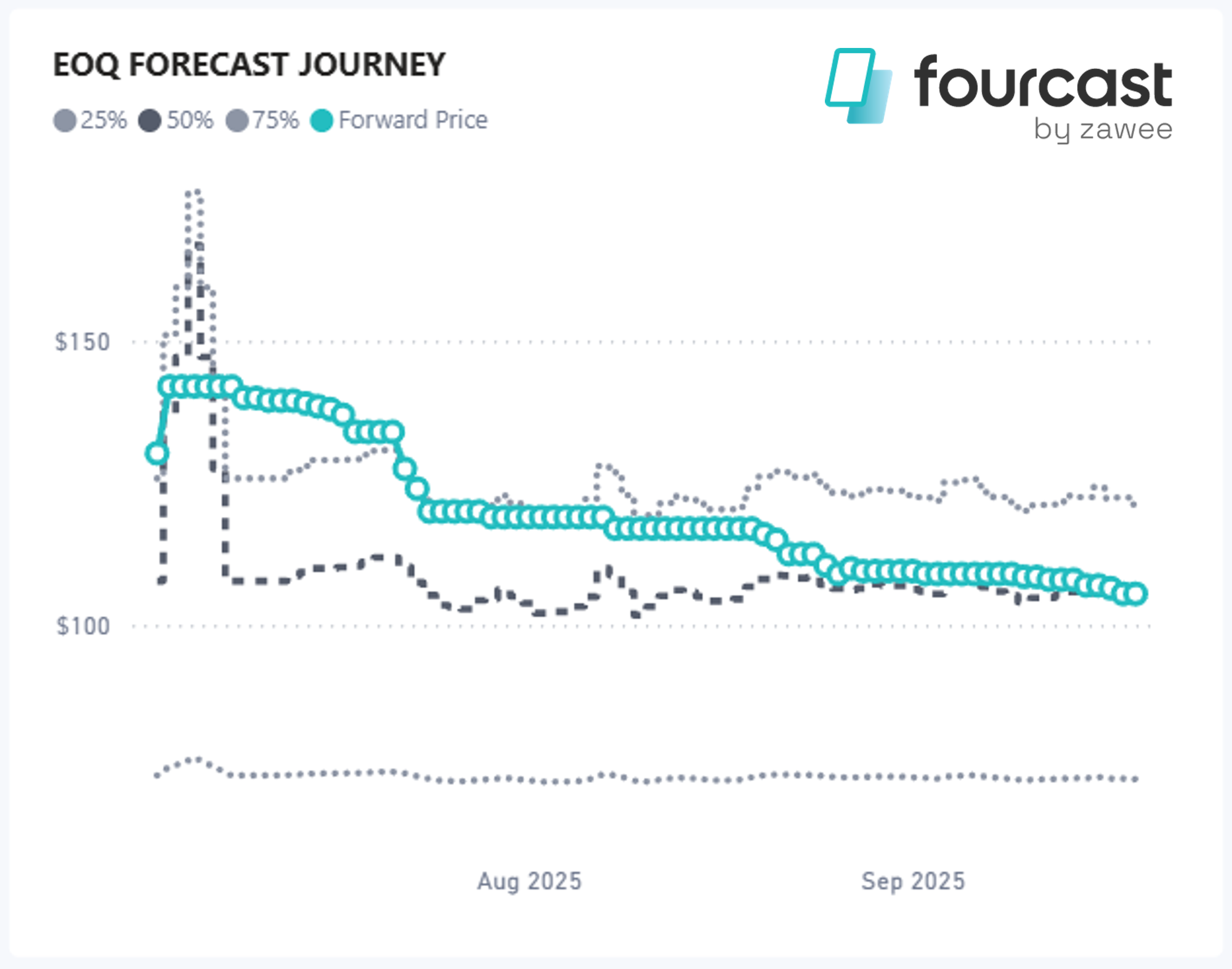Our median forecast opened at $107/MWh and, from 22 August onward, moved to within $4/MWh of the softened forward market. By 16 September the two series were fully aligned near $107/MWh. The early volatility premium has largely disappeared.