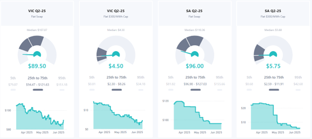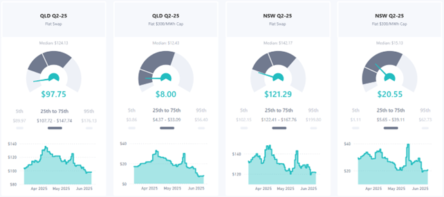 The following figures show our probabilistic spot forecast for the quarter, and the needle on each dial and bold value show last night’s closing price for the quarter as at 4:00 pm.